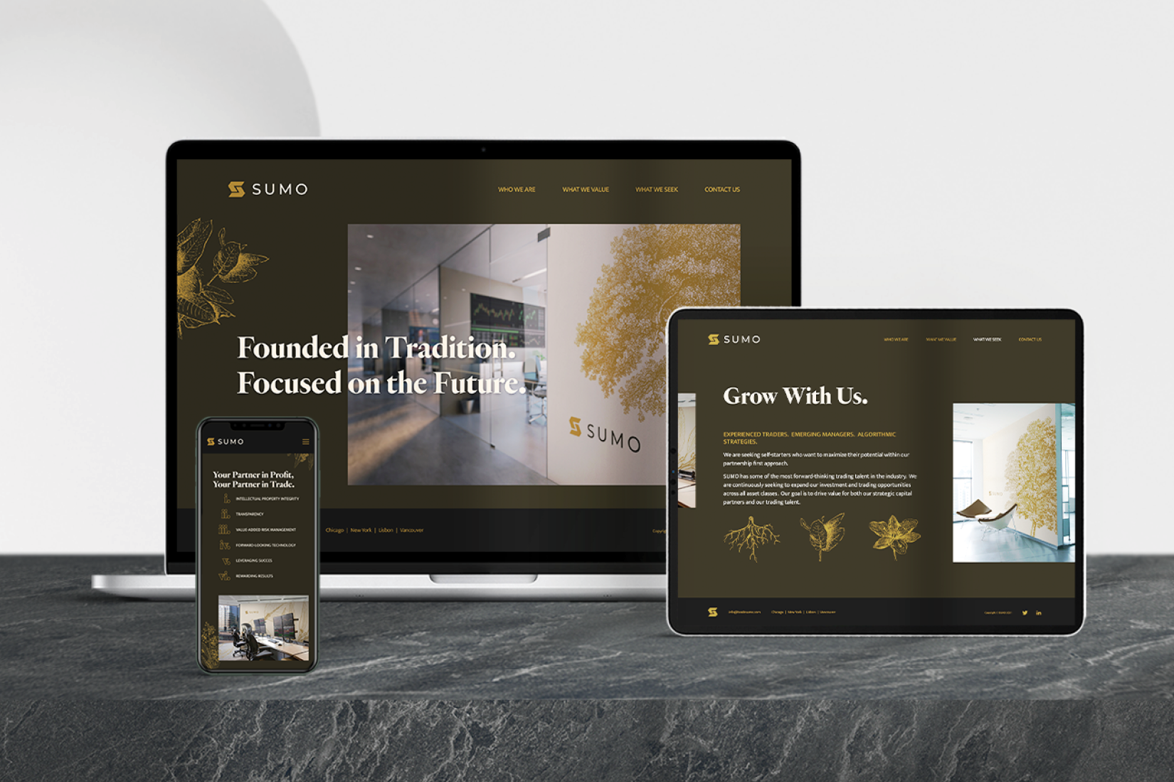 Sumo is a global financial trading firm that was looking to have their brand tell a story of sophistication and growth. Sprawling botanical illustrations throughout the identity are indicative of small investments blossoming over time, and are complimentarily contrasted by the strong geometric nature of the primary mark, which establishes a firm, trustworthy foundation