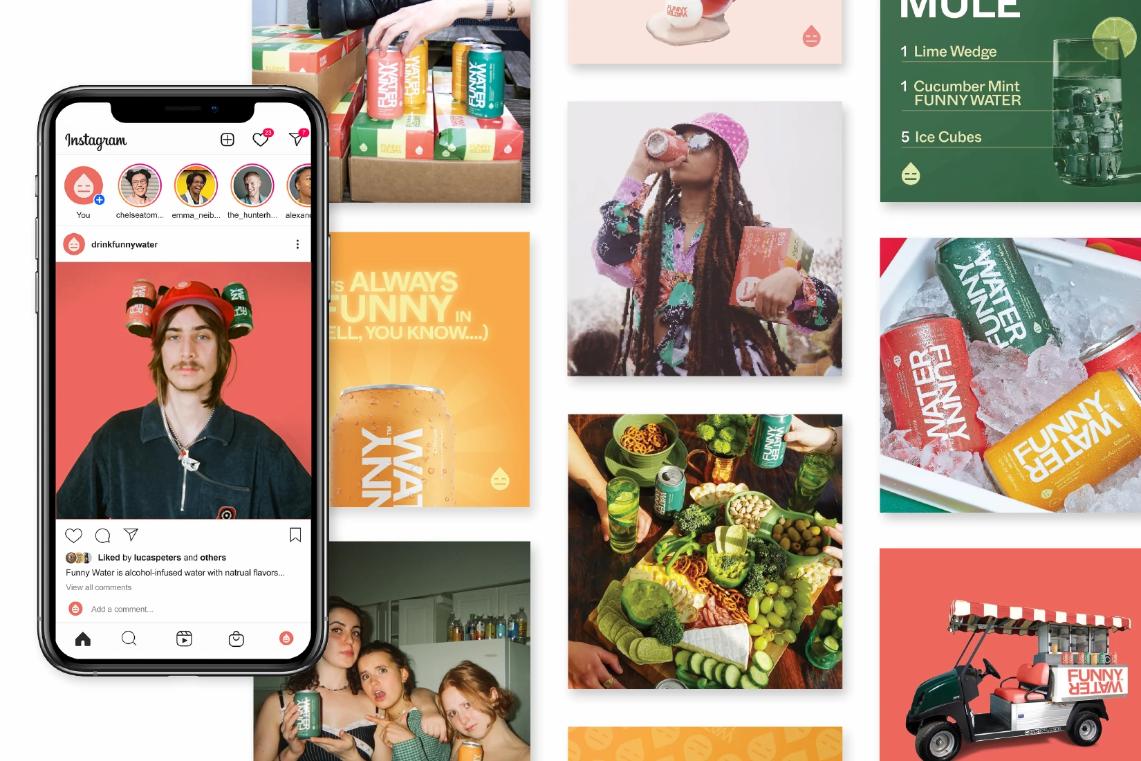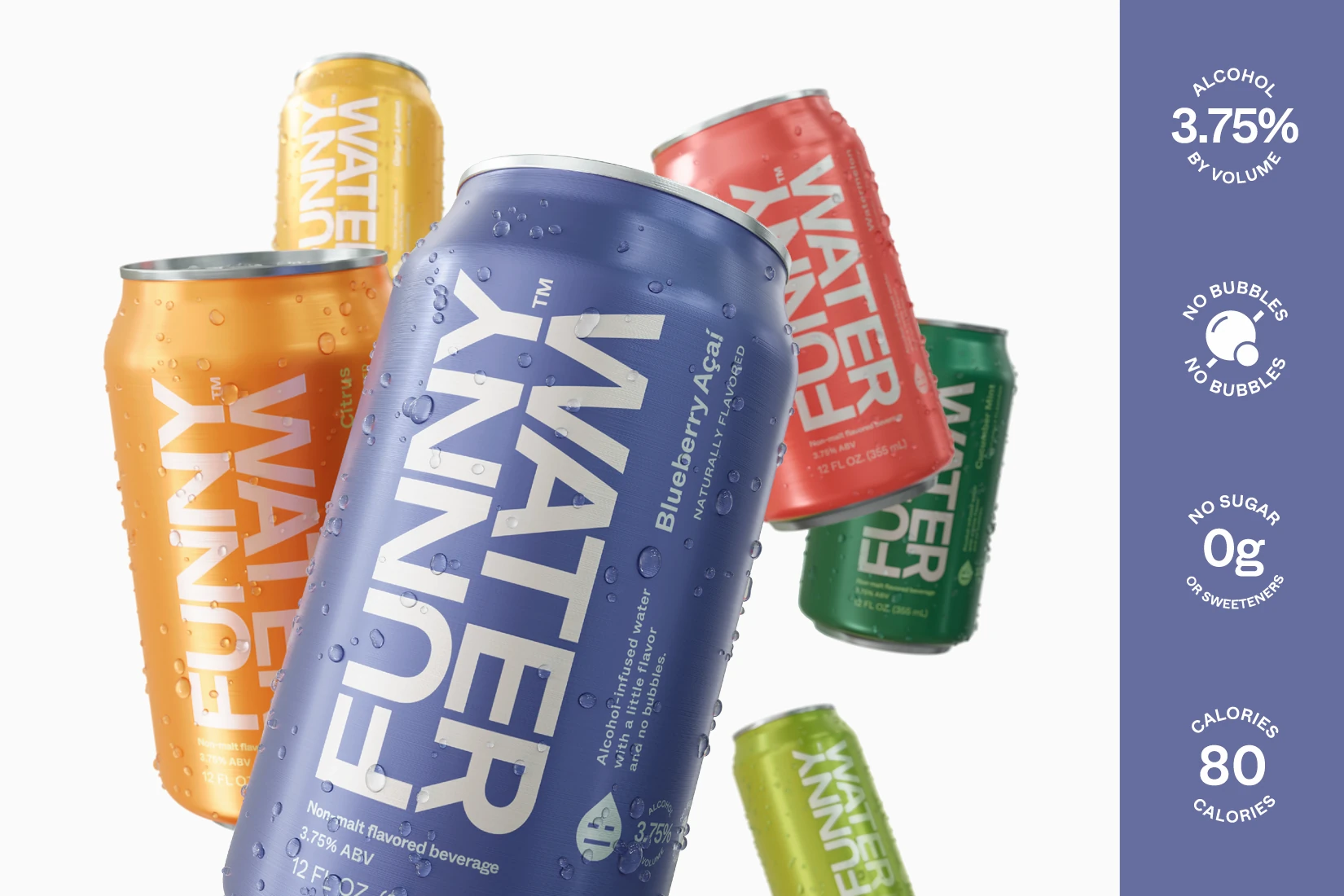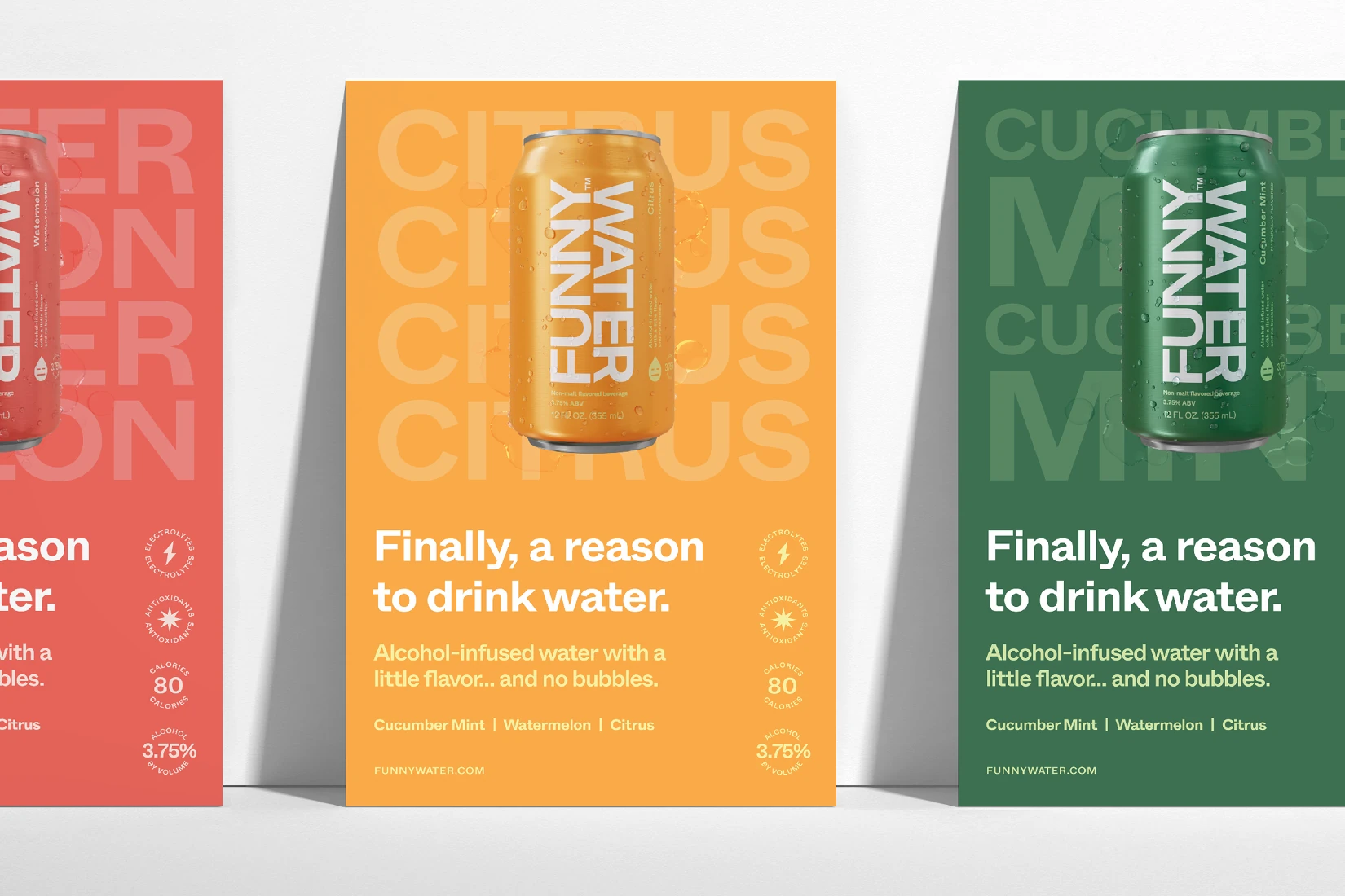 As a low ABV, non-carbonated water with a snarky brand voice, Funny Water stands alone in the alcohol industry. Consequently, it needed an identity that was as refreshing and unique as its subtle flavors. Ultimately, a hyper minimalistic approach was taken, in order to be adaptable and distinctly different from anything else in the beverage space. With its flat swaths of bold color, and it’s focus on clean typography, Funny Water is just as enjoyable to look at as it is to drink.
