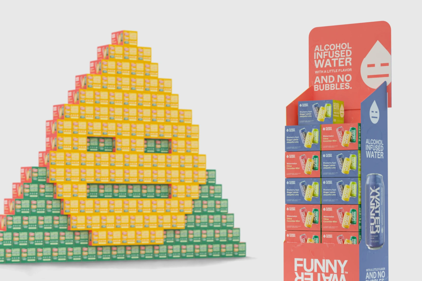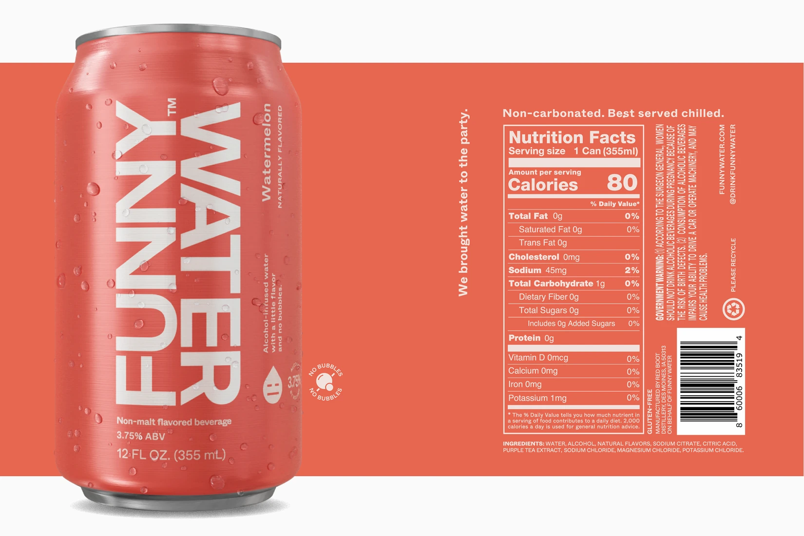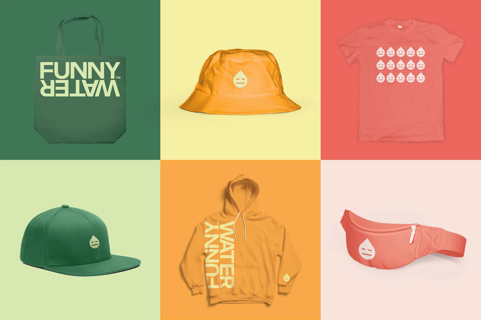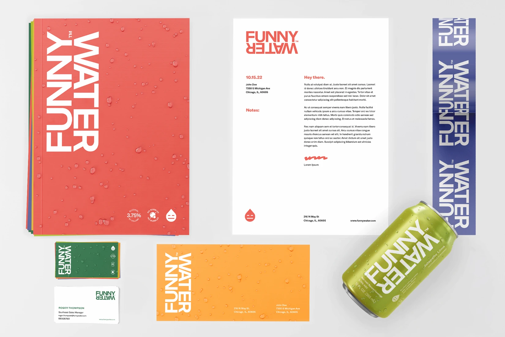 As a low ABV, non-carbonated water with a snarky brand voice, Funny Water stands alone in the alcohol industry. Consequently, it needed an identity that was as refreshing and unique as its subtle flavors. Ultimately, a hyper minimalistic approach was taken, in order to be adaptable and distinctly different from anything else in the beverage space. With its flat swaths of bold color, and it’s focus on clean typography, Funny Water is just as enjoyable to look at as it is to drink.