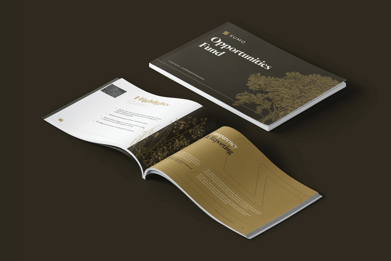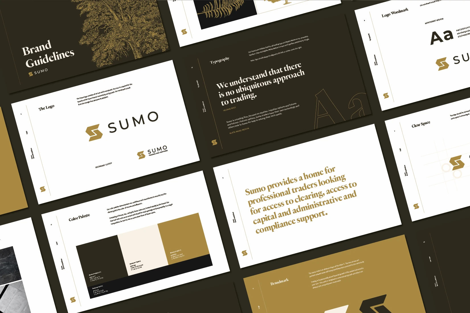 Sumo is a global financial trading firm that was looking to have their brand tell a story of sophistication and growth. Sprawling botanical illustrations throughout the identity are indicative of small investments blossoming over time, and are complimentarily contrasted by the strong geometric nature of the primary mark, which establishes a firm, trustworthy foundation