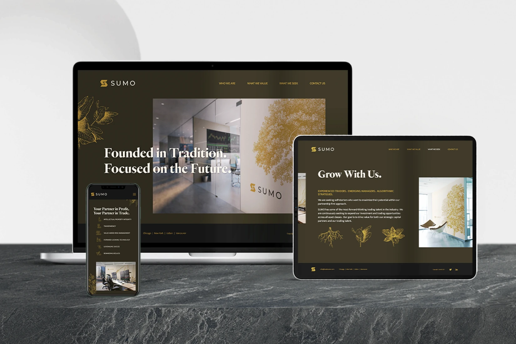 Sumo is a global financial trading firm that was looking to have their brand tell a story of sophistication and growth. Sprawling botanical illustrations throughout the identity are indicative of small investments blossoming over time, and are complimentarily contrasted by the strong geometric nature of the primary mark, which establishes a firm, trustworthy foundation